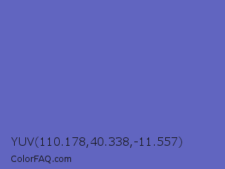 YUV 110.178,40.338,-11.557 Color is a normal blue color and the nearest color is Blue Violet #6456b7. Hex code #6165c0 and RGB value is rgb(97,101,192). In RGB color space, this color is composed of 38% red, 40% green, 75% blue, In CMYK color space, this color is composed of 49% cyan, 47% magenta, 0% yellow , 25% black , In HSL color space, this color has a hue angle of 237° , 43% saturation and 57% lightness.