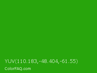 YUV 110.183,-48.404,-61.55 Color is a normal green color and the nearest color is Slimy Green #299617. Hex code #28a50c and RGB value is rgb(40,165,12). In RGB color space, this color is composed of 16% red, 65% green, 5% blue, In CMYK color space, this color is composed of 76% cyan, 0% magenta, 93% yellow , 35% black , In HSL color space, this color has a hue angle of 109° , 86% saturation and 35% lightness.