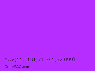 YUV 110.191,71.391,62.099 Color is a normal purple color and the nearest color is Veronica #a020f0. Hex code #b52eff and RGB value is rgb(181,46,255). In RGB color space, this color is composed of 71% red, 18% green, 100% blue, In CMYK color space, this color is composed of 29% cyan, 82% magenta, 0% yellow , 0% black , In HSL color space, this color has a hue angle of 279° , 100% saturation and 59% lightness.