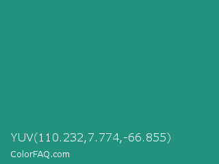 YUV 110.232,7.774,-66.855 Color is a normal cyan color and the nearest color is Lochinvar #2c8c84. Hex code #22927e and RGB value is rgb(34,146,126). In RGB color space, this color is composed of 13% red, 57% green, 49% blue, In CMYK color space, this color is composed of 77% cyan, 0% magenta, 14% yellow , 43% black , In HSL color space, this color has a hue angle of 169° , 62% saturation and 35% lightness.