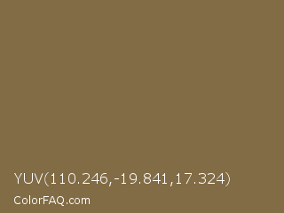 YUV 110.246,-19.841,17.324 Color is a normal orange color and the nearest color is Raw Umber #826644. Hex code #826c46 and RGB value is rgb(130,108,70). In RGB color space, this color is composed of 51% red, 42% green, 27% blue, In CMYK color space, this color is composed of 0% cyan, 17% magenta, 46% yellow , 49% black , In HSL color space, this color has a hue angle of 38° , 30% saturation and 39% lightness.