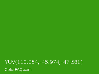 YUV 110.254,-45.974,-47.581 Color is a normal green color and the nearest color is Slimy Green #299617. Hex code #389c11 and RGB value is rgb(56,156,17). In RGB color space, this color is composed of 22% red, 61% green, 7% blue, In CMYK color space, this color is composed of 64% cyan, 0% magenta, 89% yellow , 39% black , In HSL color space, this color has a hue angle of 103° , 80% saturation and 34% lightness.