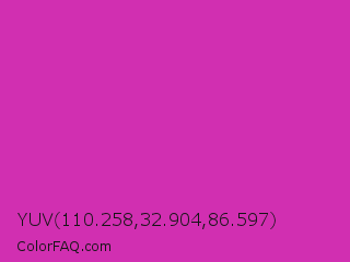 YUV 110.258,32.904,86.597 Color is a normal magenta color and the nearest color is Byzantine #bd33a4. Hex code #d12fb1 and RGB value is rgb(209,47,177). In RGB color space, this color is composed of 82% red, 18% green, 69% blue, In CMYK color space, this color is composed of 0% cyan, 78% magenta, 15% yellow , 18% black , In HSL color space, this color has a hue angle of 312° , 64% saturation and 50% lightness.