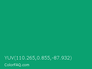 YUV 110.265,0.855,-87.932 Color is a normal green color and the nearest color is Green NCS #009f6b. Hex code #0aa170 and RGB value is rgb(10,161,112). In RGB color space, this color is composed of 4% red, 63% green, 44% blue, In CMYK color space, this color is composed of 94% cyan, 0% magenta, 30% yellow , 37% black , In HSL color space, this color has a hue angle of 161° , 88% saturation and 34% lightness.