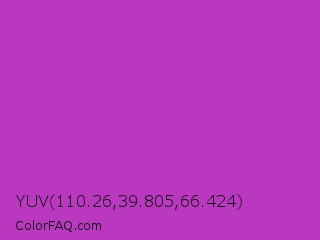 YUV 110.26,39.805,66.424 Color is a normal magenta color and the nearest color is Steel Pink #cc33cc. Hex code #ba38bf and RGB value is rgb(186,56,191). In RGB color space, this color is composed of 73% red, 22% green, 75% blue, In CMYK color space, this color is composed of 3% cyan, 71% magenta, 0% yellow , 25% black , In HSL color space, this color has a hue angle of 298° , 55% saturation and 48% lightness.