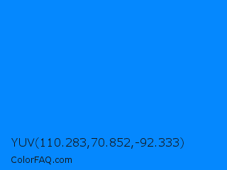 YUV 110.283,70.852,-92.333 Color is a normal blue color and the nearest color is Azure Radiance #007fff. Hex code #0588fe and RGB value is rgb(5,136,254). In RGB color space, this color is composed of 2% red, 53% green, 100% blue, In CMYK color space, this color is composed of 98% cyan, 46% magenta, 0% yellow , 0% black , In HSL color space, this color has a hue angle of 208° , 99% saturation and 51% lightness.