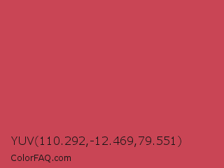 YUV 110.292,-12.469,79.551 Color is a normal red color and the nearest color is Brick Red #cb4154. Hex code #c94555 and RGB value is rgb(201,69,85). In RGB color space, this color is composed of 79% red, 27% green, 33% blue, In CMYK color space, this color is composed of 0% cyan, 66% magenta, 58% yellow , 21% black , In HSL color space, this color has a hue angle of 353° , 55% saturation and 53% lightness.