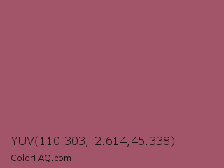 YUV 110.303,-2.614,45.338 Color is a normal rose color and the nearest color is China Rose #a8516e. Hex code #a25569 and RGB value is rgb(162,85,105). In RGB color space, this color is composed of 64% red, 33% green, 41% blue, In CMYK color space, this color is composed of 0% cyan, 48% magenta, 35% yellow , 36% black , In HSL color space, this color has a hue angle of 344° , 31% saturation and 48% lightness.