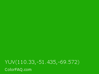 YUV 110.33,-51.435,-69.572 Color is a normal green color and the nearest color is Slimy Green #299617. Hex code #1fab06 and RGB value is rgb(31,171,6). In RGB color space, this color is composed of 12% red, 67% green, 2% blue, In CMYK color space, this color is composed of 82% cyan, 0% magenta, 96% yellow , 33% black , In HSL color space, this color has a hue angle of 111° , 93% saturation and 35% lightness.