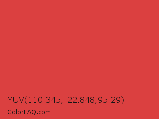 YUV 110.345,-22.848,95.29 Color is a normal red color and the nearest color is Jasper #d73b3e. Hex code #db4040 and RGB value is rgb(219,64,64). In RGB color space, this color is composed of 86% red, 25% green, 25% blue, In CMYK color space, this color is composed of 0% cyan, 71% magenta, 71% yellow , 14% black , In HSL color space, this color has a hue angle of 0° , 68% saturation and 55% lightness.