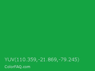 YUV 110.359,-21.869,-79.245 Color is a normal green color and the nearest color is Green Pantone #00ad43. Hex code #14a542 and RGB value is rgb(20,165,66). In RGB color space, this color is composed of 8% red, 65% green, 26% blue, In CMYK color space, this color is composed of 88% cyan, 0% magenta, 60% yellow , 35% black , In HSL color space, this color has a hue angle of 139° , 78% saturation and 36% lightness.