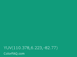 YUV 110.378,6.223,-82.77 Color is a normal cyan color and the nearest color is Gossamer #069b81. Hex code #109c7b and RGB value is rgb(16,156,123). In RGB color space, this color is composed of 6% red, 61% green, 48% blue, In CMYK color space, this color is composed of 90% cyan, 0% magenta, 21% yellow , 39% black , In HSL color space, this color has a hue angle of 166° , 81% saturation and 34% lightness.