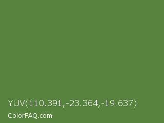 YUV 110.391,-23.364,-19.637 Color is a normal green color and the nearest color is Hippie Green #53824b. Hex code #58833f and RGB value is rgb(88,131,63). In RGB color space, this color is composed of 35% red, 51% green, 25% blue, In CMYK color space, this color is composed of 33% cyan, 0% magenta, 52% yellow , 49% black , In HSL color space, this color has a hue angle of 98° , 35% saturation and 38% lightness.