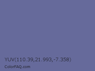 YUV 110.39,21.993,-7.358 Color is a normal blue color and the nearest color is Dark Blue Gray #666699. Hex code #666a9b and RGB value is rgb(102,106,155). In RGB color space, this color is composed of 40% red, 42% green, 61% blue, In CMYK color space, this color is composed of 34% cyan, 32% magenta, 0% yellow , 39% black , In HSL color space, this color has a hue angle of 235° , 21% saturation and 50% lightness.