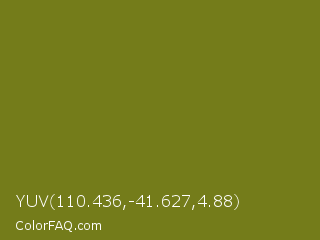 YUV 110.436,-41.627,4.88 Color is a dark yellow color and the nearest color is Pacifika #778120. Hex code #747c1a and RGB value is rgb(116,124,26). In RGB color space, this color is composed of 45% red, 49% green, 10% blue, In CMYK color space, this color is composed of 6% cyan, 0% magenta, 79% yellow , 51% black , In HSL color space, this color has a hue angle of 65° , 65% saturation and 29% lightness.