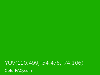 YUV 110.499,-54.476,-74.106 Color is a normal green color and the nearest color is Slimy Green #299617. Hex code #1aaf00 and RGB value is rgb(26,175,-0). In RGB color space, this color is composed of 10% red, 69% green, 0% blue, In CMYK color space, this color is composed of 85% cyan, 0% magenta, 100% yellow , 31% black , In HSL color space, this color has a hue angle of 111° , 100% saturation and 34% lightness.