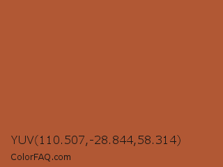 YUV 110.507,-28.844,58.314 Color is a normal orange color and the nearest color is Brown Rust #af593e. Hex code #b15834 and RGB value is rgb(177,88,52). In RGB color space, this color is composed of 69% red, 35% green, 20% blue, In CMYK color space, this color is composed of 0% cyan, 50% magenta, 71% yellow , 31% black , In HSL color space, this color has a hue angle of 17° , 55% saturation and 45% lightness.
