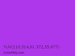 YUV 110.514,61.372,55.677 Color is a normal purple color and the nearest color is Veronica #a020f0. Hex code #ae36eb and RGB value is rgb(174,54,235). In RGB color space, this color is composed of 68% red, 21% green, 92% blue, In CMYK color space, this color is composed of 26% cyan, 77% magenta, 0% yellow , 8% black , In HSL color space, this color has a hue angle of 280° , 82% saturation and 57% lightness.