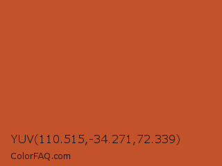 YUV 110.515,-34.271,72.339 Color is a normal orange color and the nearest color is Tuscany #bd5e2e. Hex code #c15229 and RGB value is rgb(193,82,41). In RGB color space, this color is composed of 76% red, 32% green, 16% blue, In CMYK color space, this color is composed of 0% cyan, 58% magenta, 79% yellow , 24% black , In HSL color space, this color has a hue angle of 16° , 65% saturation and 46% lightness.