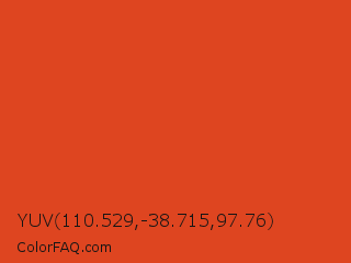 YUV 110.529,-38.715,97.76 Color is a normal red color and the nearest color is Vermilion #d9381e. Hex code #de4520 and RGB value is rgb(222,69,32). In RGB color space, this color is composed of 87% red, 27% green, 13% blue, In CMYK color space, this color is composed of 0% cyan, 69% magenta, 86% yellow , 13% black , In HSL color space, this color has a hue angle of 12° , 75% saturation and 50% lightness.