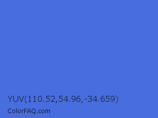 YUV 110.52,54.96,-34.659 Color is a normal blue color and the nearest color is Royal Blue #4169e1. Hex code #476dde and RGB value is rgb(71,109,222). In RGB color space, this color is composed of 28% red, 43% green, 87% blue, In CMYK color space, this color is composed of 68% cyan, 51% magenta, 0% yellow , 13% black , In HSL color space, this color has a hue angle of 225° , 70% saturation and 57% lightness.