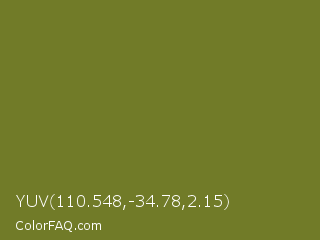 YUV 110.548,-34.78,2.15 Color is a normal yellow color and the nearest color is Crete #737829. Hex code #717b28 and RGB value is rgb(113,123,40). In RGB color space, this color is composed of 44% red, 48% green, 16% blue, In CMYK color space, this color is composed of 8% cyan, 0% magenta, 67% yellow , 52% black , In HSL color space, this color has a hue angle of 67° , 51% saturation and 32% lightness.