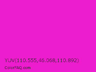 YUV 110.555,46.068,110.892 Color is a normal magenta color and the nearest color is Hot Magenta #ff1dce. Hex code #ed1ccc and RGB value is rgb(237,28,204). In RGB color space, this color is composed of 93% red, 11% green, 80% blue, In CMYK color space, this color is composed of 0% cyan, 88% magenta, 14% yellow , 7% black , In HSL color space, this color has a hue angle of 309° , 85% saturation and 52% lightness.