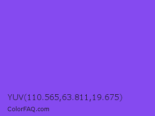 YUV 110.565,63.811,19.675 Color is a light violet color and the nearest color is Navy Purple #9457eb. Hex code #854af0 and RGB value is rgb(133,74,240). In RGB color space, this color is composed of 52% red, 29% green, 94% blue, In CMYK color space, this color is composed of 45% cyan, 69% magenta, 0% yellow , 6% black , In HSL color space, this color has a hue angle of 261° , 85% saturation and 62% lightness.