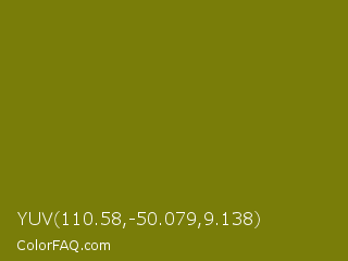 YUV 110.58,-50.079,9.138 Color is a dark yellow color and the nearest color is Olive #808000. Hex code #797d09 and RGB value is rgb(121,125,9). In RGB color space, this color is composed of 47% red, 49% green, 4% blue, In CMYK color space, this color is composed of 3% cyan, 0% magenta, 93% yellow , 51% black , In HSL color space, this color has a hue angle of 62° , 87% saturation and 26% lightness.