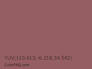 YUV 110.613,-6.218,34.542 Color is a normal red color and the nearest color is Au Chico #97605d. Hex code #965d62 and RGB value is rgb(150,93,98). In RGB color space, this color is composed of 59% red, 36% green, 38% blue, In CMYK color space, this color is composed of 0% cyan, 38% magenta, 35% yellow , 41% black , In HSL color space, this color has a hue angle of 355° , 23% saturation and 48% lightness.