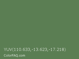 YUV 110.633,-13.623,-17.218 Color is a normal green color and the nearest color is Hippie Green #53824b. Hex code #5b7e53 and RGB value is rgb(91,126,83). In RGB color space, this color is composed of 36% red, 49% green, 33% blue, In CMYK color space, this color is composed of 28% cyan, 0% magenta, 34% yellow , 51% black , In HSL color space, this color has a hue angle of 109° , 21% saturation and 41% lightness.