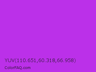 YUV 110.651,60.318,66.958 Color is a normal purple color and the nearest color is Veronica #a020f0. Hex code #bb30e9 and RGB value is rgb(187,48,233). In RGB color space, this color is composed of 73% red, 19% green, 91% blue, In CMYK color space, this color is composed of 20% cyan, 79% magenta, 0% yellow , 9% black , In HSL color space, this color has a hue angle of 285° , 81% saturation and 55% lightness.