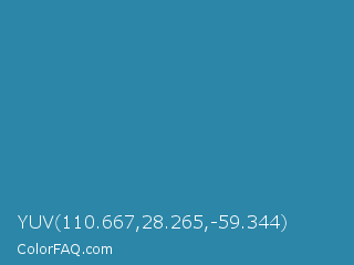 YUV 110.667,28.265,-59.344 Color is a normal blue color and the nearest color is Astral #327da0. Hex code #2b86a8 and RGB value is rgb(43,134,168). In RGB color space, this color is composed of 17% red, 53% green, 66% blue, In CMYK color space, this color is composed of 74% cyan, 20% magenta, 0% yellow , 34% black , In HSL color space, this color has a hue angle of 196° , 59% saturation and 41% lightness.