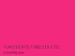 YUV 110.675,7.062,115.172 Color is a normal rose color and the nearest color is Cerise Pink #ec3b83. Hex code #f2297d and RGB value is rgb(242,41,125). In RGB color space, this color is composed of 95% red, 16% green, 49% blue, In CMYK color space, this color is composed of 0% cyan, 83% magenta, 48% yellow , 5% black , In HSL color space, this color has a hue angle of 335° , 89% saturation and 55% lightness.