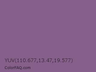 YUV 110.677,13.47,19.577 Color is a normal magenta color and the nearest color is Chinese Violet #856088. Hex code #855e8a and RGB value is rgb(133,94,138). In RGB color space, this color is composed of 52% red, 37% green, 54% blue, In CMYK color space, this color is composed of 4% cyan, 32% magenta, 0% yellow , 46% black , In HSL color space, this color has a hue angle of 293° , 19% saturation and 45% lightness.