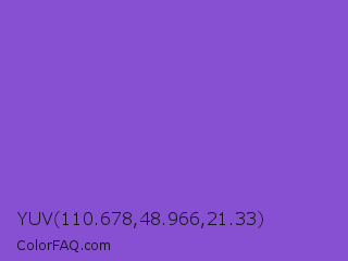 YUV 110.678,48.966,21.33 Color is a normal violet color and the nearest color is Fuchsia Blue #7a58c1. Hex code #874fd2 and RGB value is rgb(135,79,210). In RGB color space, this color is composed of 53% red, 31% green, 82% blue, In CMYK color space, this color is composed of 36% cyan, 62% magenta, 0% yellow , 18% black , In HSL color space, this color has a hue angle of 266° , 59% saturation and 57% lightness.
