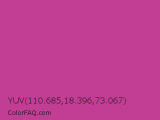 YUV 110.685,18.396,73.067 Color is a normal magenta color and the nearest color is Smitten #c84186. Hex code #c23d94 and RGB value is rgb(194,61,148). In RGB color space, this color is composed of 76% red, 24% green, 58% blue, In CMYK color space, this color is composed of 0% cyan, 69% magenta, 24% yellow , 24% black , In HSL color space, this color has a hue angle of 321° , 52% saturation and 50% lightness.