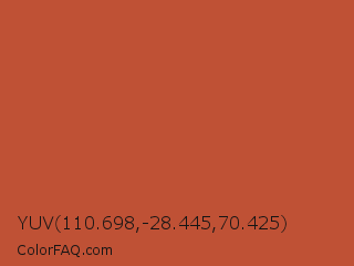 YUV 110.698,-28.445,70.425 Color is a normal red color and the nearest color is Mojo #c04737. Hex code #bf5135 and RGB value is rgb(191,81,53). In RGB color space, this color is composed of 75% red, 32% green, 21% blue, In CMYK color space, this color is composed of 0% cyan, 58% magenta, 72% yellow , 25% black , In HSL color space, this color has a hue angle of 12° , 57% saturation and 48% lightness.