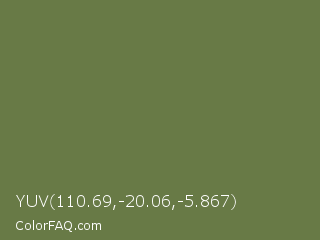 YUV 110.69,-20.06,-5.867 Color is a normal green color and the nearest color is Dingley #5d7747. Hex code #687a46 and RGB value is rgb(104,122,70). In RGB color space, this color is composed of 41% red, 48% green, 27% blue, In CMYK color space, this color is composed of 15% cyan, 0% magenta, 43% yellow , 52% black , In HSL color space, this color has a hue angle of 81° , 27% saturation and 38% lightness.