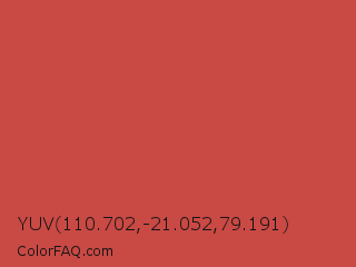 YUV 110.702,-21.052,79.191 Color is a normal red color and the nearest color is English Vermillion #cc474b. Hex code #c94944 and RGB value is rgb(201,73,68). In RGB color space, this color is composed of 79% red, 29% green, 27% blue, In CMYK color space, this color is composed of 0% cyan, 64% magenta, 66% yellow , 21% black , In HSL color space, this color has a hue angle of 2° , 55% saturation and 53% lightness.