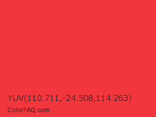 YUV 110.711,-24.508,114.263 Color is a normal red color and the nearest color is Deep Carmine Pink #ef3038. Hex code #f1363d and RGB value is rgb(241,54,61). In RGB color space, this color is composed of 95% red, 21% green, 24% blue, In CMYK color space, this color is composed of 0% cyan, 78% magenta, 75% yellow , 5% black , In HSL color space, this color has a hue angle of 358° , 87% saturation and 58% lightness.