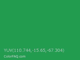 YUV 110.744,-15.65,-67.304 Color is a normal green color and the nearest color is Eucalyptus #278a5b. Hex code #229c4f and RGB value is rgb(34,156,79). In RGB color space, this color is composed of 13% red, 61% green, 31% blue, In CMYK color space, this color is composed of 78% cyan, 0% magenta, 49% yellow , 39% black , In HSL color space, this color has a hue angle of 142° , 64% saturation and 37% lightness.