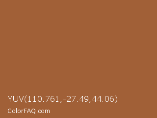 YUV 110.761,-27.49,44.06 Color is a normal orange color and the nearest color is Sepia Skin #9e5b40. Hex code #a16037 and RGB value is rgb(161,96,55). In RGB color space, this color is composed of 63% red, 38% green, 22% blue, In CMYK color space, this color is composed of 0% cyan, 40% magenta, 66% yellow , 37% black , In HSL color space, this color has a hue angle of 23° , 49% saturation and 42% lightness.