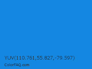 YUV 110.761,55.827,-79.597 Color is a normal blue color and the nearest color is Rich Electric Blue #0892d0. Hex code #1487e0 and RGB value is rgb(20,135,224). In RGB color space, this color is composed of 8% red, 53% green, 88% blue, In CMYK color space, this color is composed of 91% cyan, 40% magenta, 0% yellow , 12% black , In HSL color space, this color has a hue angle of 206° , 84% saturation and 48% lightness.