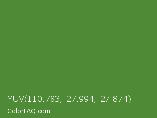YUV 110.783,-27.994,-27.874 Color is a normal green color and the nearest color is May Green #4c9141. Hex code #4f8a36 and RGB value is rgb(79,138,54). In RGB color space, this color is composed of 31% red, 54% green, 21% blue, In CMYK color space, this color is composed of 43% cyan, 0% magenta, 61% yellow , 46% black , In HSL color space, this color has a hue angle of 102° , 44% saturation and 38% lightness.