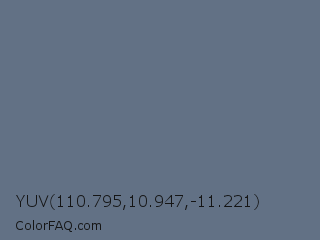 YUV 110.795,10.947,-11.221 Color is a normal blue color and the nearest color is Pale Sky #6e7783. Hex code #627185 and RGB value is rgb(98,113,133). In RGB color space, this color is composed of 38% red, 44% green, 52% blue, In CMYK color space, this color is composed of 26% cyan, 15% magenta, 0% yellow , 48% black , In HSL color space, this color has a hue angle of 214° , 15% saturation and 45% lightness.