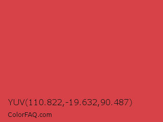 YUV 110.822,-19.632,90.487 Color is a normal red color and the nearest color is Jasper #d73b3e. Hex code #d64247 and RGB value is rgb(214,66,71). In RGB color space, this color is composed of 84% red, 26% green, 28% blue, In CMYK color space, this color is composed of 0% cyan, 69% magenta, 67% yellow , 16% black , In HSL color space, this color has a hue angle of 358° , 64% saturation and 55% lightness.
