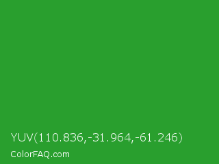 YUV 110.836,-31.964,-61.246 Color is a normal green color and the nearest color is Wageningen Green #34b233. Hex code #299f2e and RGB value is rgb(41,159,46). In RGB color space, this color is composed of 16% red, 62% green, 18% blue, In CMYK color space, this color is composed of 74% cyan, 0% magenta, 71% yellow , 38% black , In HSL color space, this color has a hue angle of 123° , 59% saturation and 39% lightness.