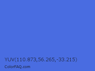 YUV 110.873,56.265,-33.215 Color is a normal blue color and the nearest color is Royal Blue #4169e1. Hex code #496ce1 and RGB value is rgb(73,108,225). In RGB color space, this color is composed of 29% red, 42% green, 88% blue, In CMYK color space, this color is composed of 68% cyan, 52% magenta, 0% yellow , 12% black , In HSL color space, this color has a hue angle of 226° , 72% saturation and 58% lightness.