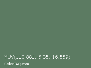 YUV 110.881,-6.35,-16.559 Color is a normal green color and the nearest color is Spring Leaves #578363. Hex code #5c7b62 and RGB value is rgb(92,123,98). In RGB color space, this color is composed of 36% red, 48% green, 38% blue, In CMYK color space, this color is composed of 25% cyan, 0% magenta, 20% yellow , 52% black , In HSL color space, this color has a hue angle of 132° , 14% saturation and 42% lightness.